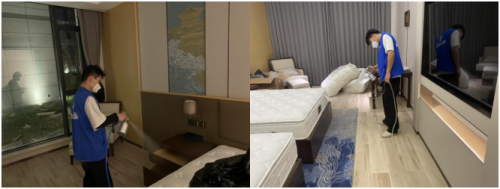 施工第3道工序:對(duì)細(xì)小家具、抽屜、床墊、木制鑲嵌柜子進(jìn)行除味工作,確保異味明顯降低,無刺激異味(人員可以正常進(jìn)出)。