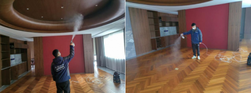 施工第1道:完全分解空氣中游離態污染物,采用方法:全空間霧化技術(空調新風窗戶需關閉)。